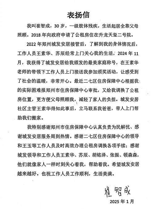 1月9日清晨,崔老師一家分別向住保中心、城發(fā)安居贈送了錦旗,并送來一封表揚信,對住保中心所展現(xiàn)的認真負責態(tài)度以及為民解憂的卓越作風表達了高度贊揚,同時也對城發(fā)安居工作給予了肯定鼓勵。