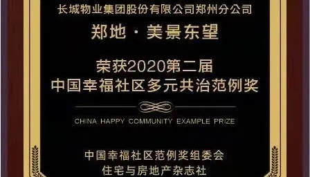 鄭地·美景東望項目榮獲“2020第二屆中國幸福社區(qū)多元共治范例獎”。